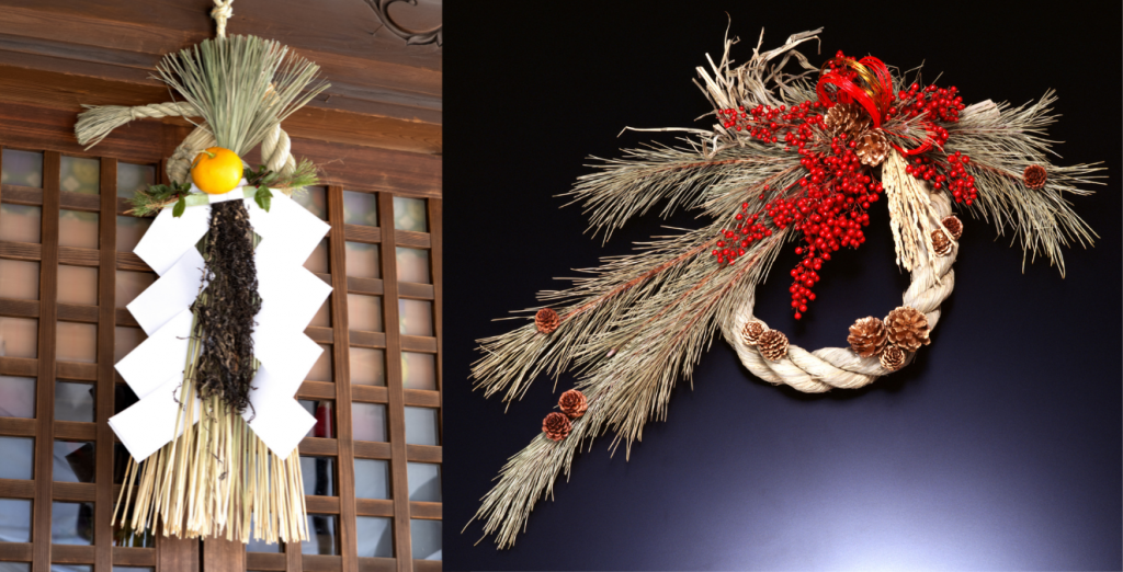 · Shimekazari (しめ飾り): Literalmente, ‘decoración (kazari) con cuerda sagrada’ (shimenawa). Se coloca en la puerta de casa para alejar a los malos espíritus e indicarle a Toshigami Sama que es un lugar puro y digno para su estancia. Hay muchos diseños y la versión más tradicional consta de una cuerda trenzada de paja que se adorna con papeles shide, ramas de pino y una naranja.