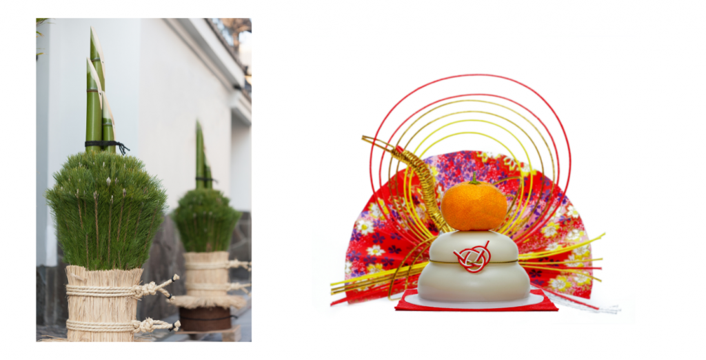 · Kadomatsu (門松): Literalmente, pino de puerta. Tradicionalmente van en pareja, representando lo masculino y femenino y se colocan a cada lado de la puerta. Tienen la misión de alojar al dios.